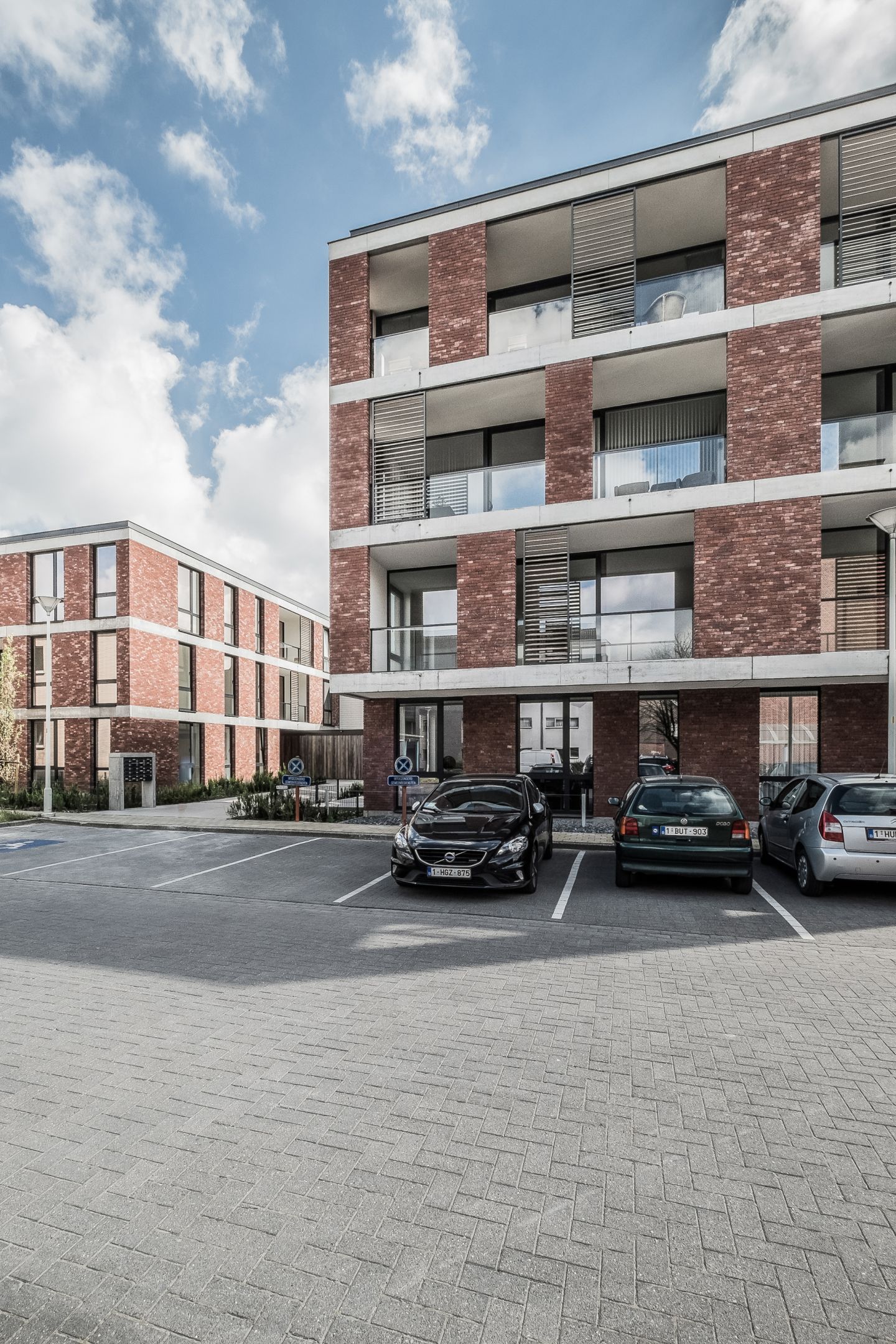 Een opdeling van het totale project in drie bouwblokken maximaliseert de bouwmogelijkheden op dit terrein en respecteert tevens de schaal van de omgeving. De onderscheiden volumes zorgen ook voor de afbakening van het pleintje aan de Handelslei en de verbinding met de achterliggende straat en gemeenteschool. Deze opdeling biedt ook nogal wat voordelen voor de lichtinval in de appartementen. Elke woongelegenheid is compact georganiseerd en beschikt over een eigen buitenruimte of terras.
