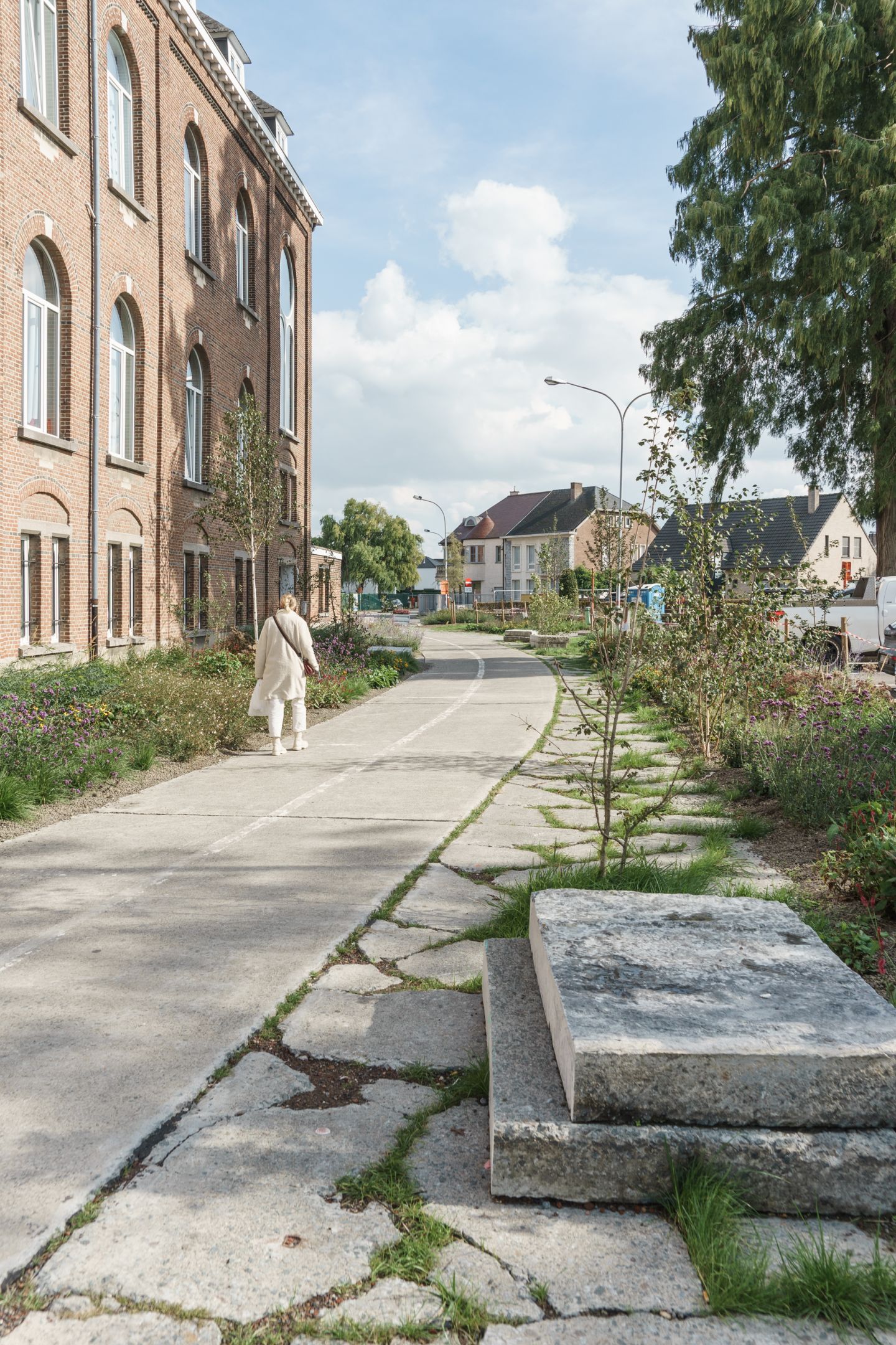 Eén rijvak met betonplaten wordt uitgebroken en onthard, er komen kleine bomen en struiken die later ook een plaats kunnen krijgen in de definitieve aanleg. Op deze plek kunnen we op korte termijn een aangename, groene schoolomgeving inrichten en kan regenwater de grond in trekken, wat enorm belangrijk is in de strijd tegen de droogte in Vlaanderen. De uitgebroken betonplaten worden herbruikt tot stapstenen, zitbanken en speelse elementen. Tot slot wijzigen we de verkeerssituatie naar de situatie zoals die in het finale masterplan is uitgewerkt. Hierdoor worden de schoolpoorten autoluw gemaakt.