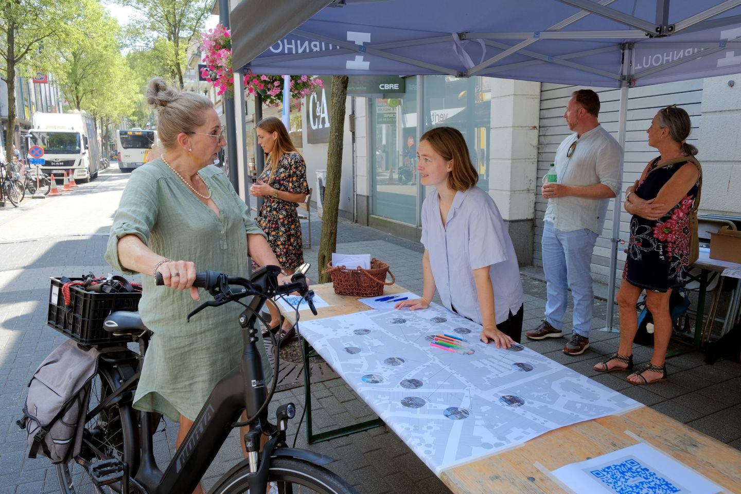 Om tot een gedragen ontwerp te komen waren het ontwerptraject en het participatietraject sterk met elkaar verweven. We liepen een uitgebreid participatietraject waar we verschillende doelgroepen hebben betrokken. In eerste instantie organiseerden we een online bevraging en interactieve workshops met de handelaars en bewoners van de Gasthuisstraat. We gingen samen op zoek naar de identiteit van de straat, de noden en de wensen. In een tweede workshop gingen we co-creatief aan de slag met het voorontwerp. Gelijktijdig stonden we met de Tafel van Turnhout in de winkelstraat en op de markt. We detecteerden de knelpunten en de dromen van jongeren, klanten, passanten… In een tweede ronde stelden we het voorontwerp voor met behulp van een VR-experience. Deelnemers konden ook stemmen op verschillende materialen die we voorstellen voor de straat. Tot slot wandelden we samen met Kannet en Mekanders, organisaties die zich inzetten voor personen met een beperking, door de Gasthuisstraat en de omgeving. We ontdekten wat voor hen de struikelblokken zijn en hoe de ideale winkelstraat er voor hen zou uitzien.