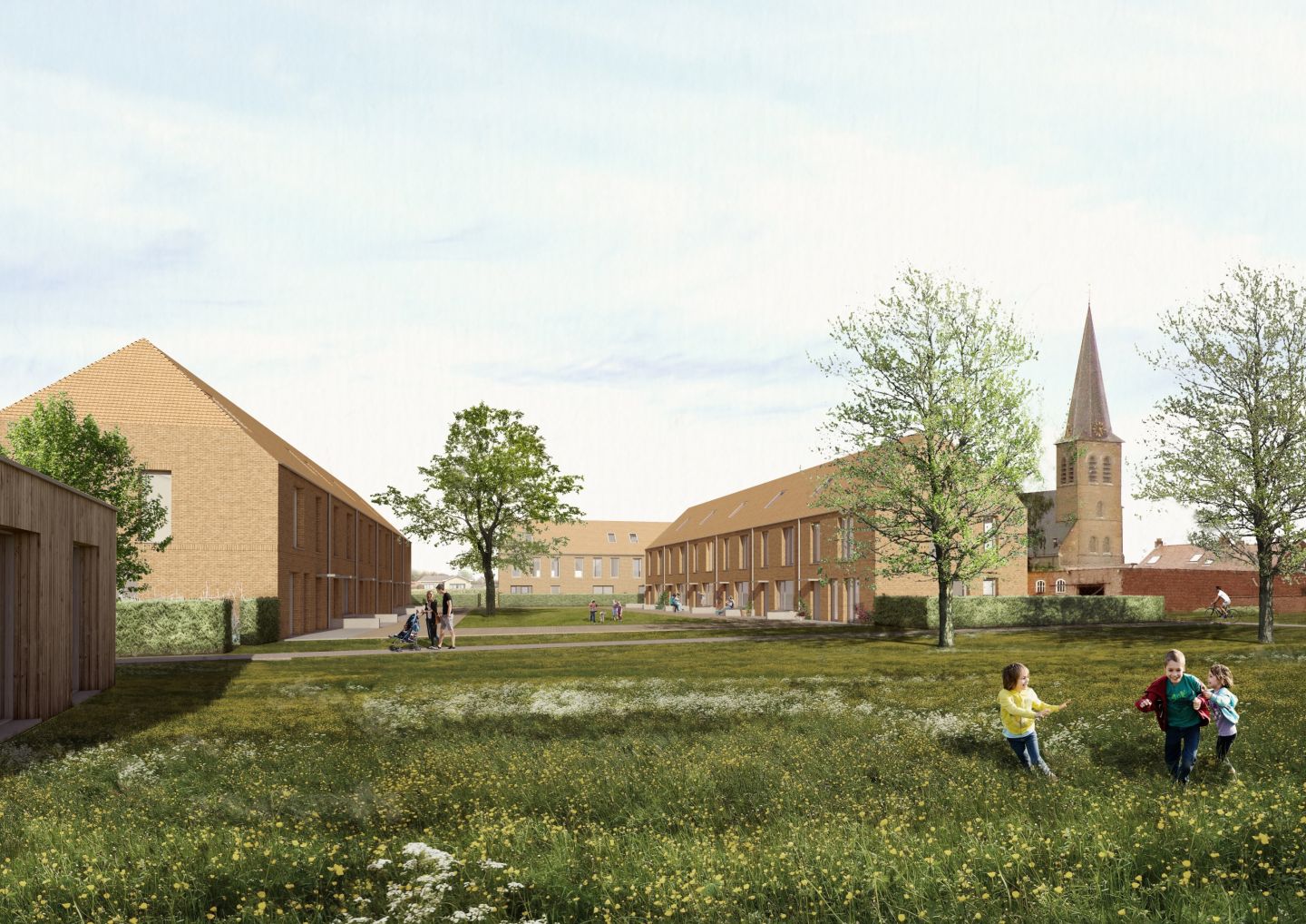 Een centrale groene ruimte ent zich op de bestaande structuur, zorgt voor uitzicht op het ruime landschap en verbindt tegelijk de wijk met het centrum en de kerk. Water wordt gebufferd en afgevoerd naar kleine beekjes en grachten. Zij behouden het agrarische karakter van deze site en begrenzen de landschapskamers. De woningen hebben een totale footprint van slechts 12-15% en ook de verharding is minimaal. Dit is een groene wijk in het centrum van het dorp.