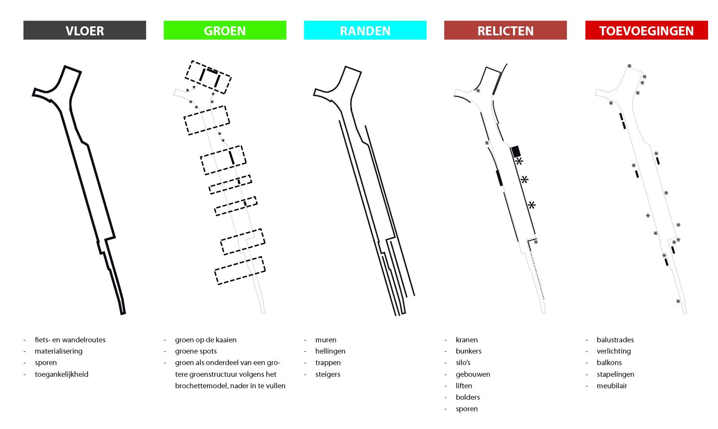 Het ontwerphandboek bundelt ideeën voor de toekomstige vormgeving en materialisering van de kaaien. Er werden vijf thema’s gedetecteerd: de vloer, het (haven)groen, de dokranden, de relicten en de toevoegingen. Samen bepalen ze de nieuwe scenografie langs de dokken. Het boek vormt een praktische leidraad voor de deelontwerpen die volgen en op die manier gefaseerd het gehele kaaigebied transformeren.