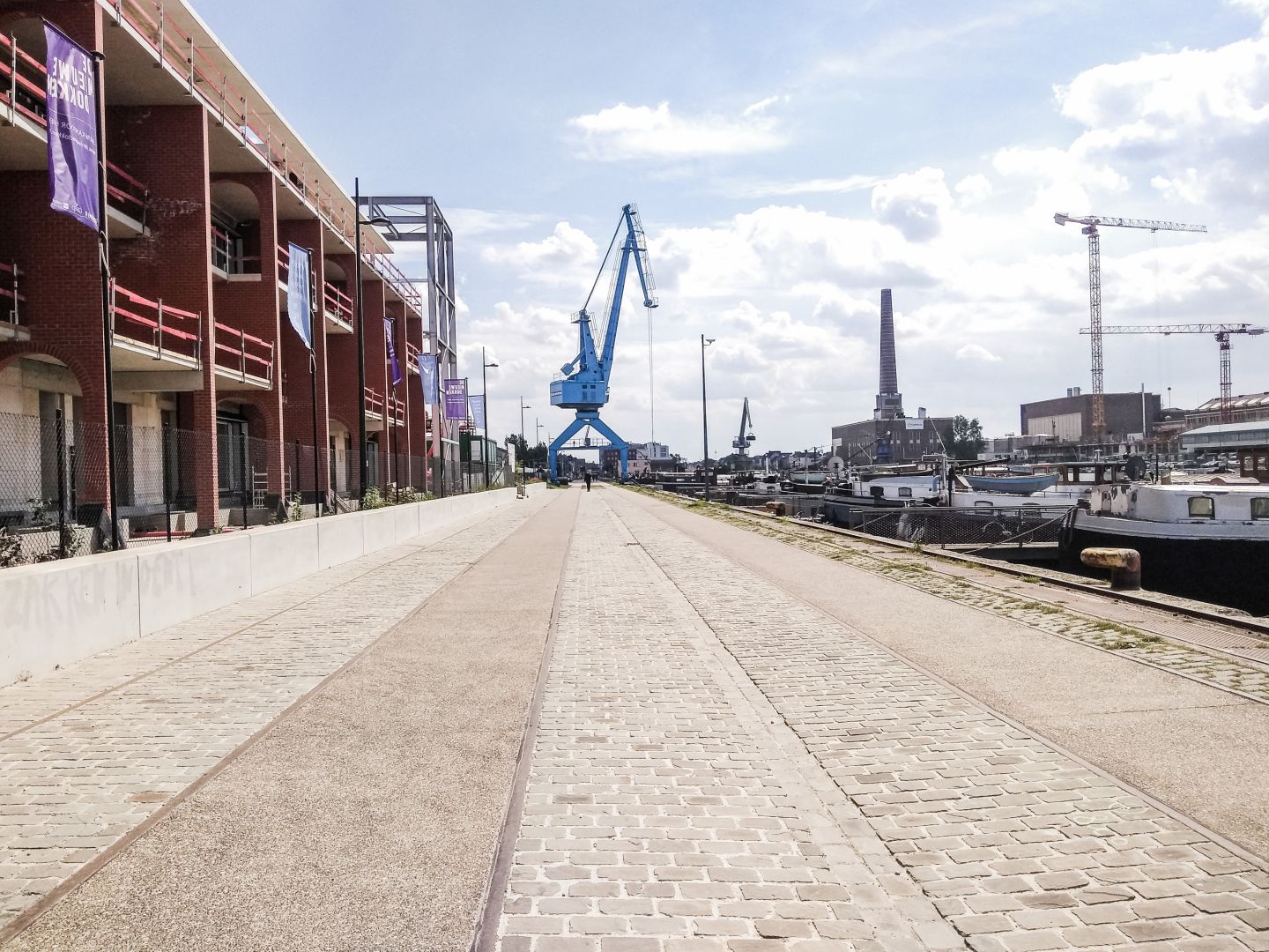 Het ontwerp behoudt de maritieme sfeer van deze plek en zet in op de functie van het toekomstige wonen. Zo worden de sporen ingezet als belijning voor de fietspaden, de aanwezige kabelgoten worden gehandhaafd en ook de oorspronkelijke laad- en loskranen krijgen hier een plek. Kasseien met grasvoeg trekken de kleine buurtparken tot tegen het water. Het uitgewassen beton tussen de sporen zet in op comfort voor fietsers en voetgangers. Voor de kleurkeuze van dit beton werd met de granulaten gewerkt die ook in de bestaande oude kaaimuur voorkomen.